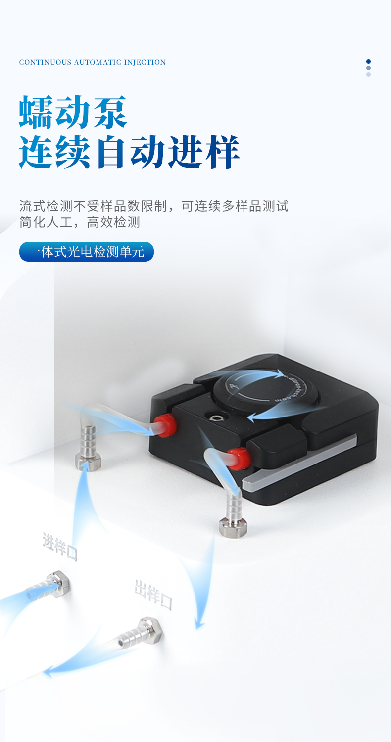 2、★采用蠕動泵連續(xù)自動進樣,流式檢測不受樣品數(shù)限制,可連續(xù)多樣品測試。